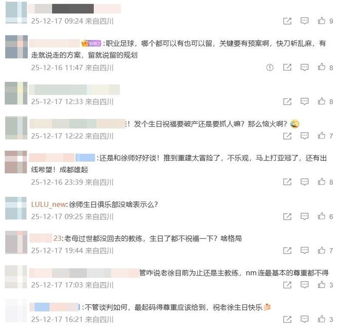 对此,不少蓉城球迷纷纷在社媒刷屏怒喷俱乐部:“真的很没有风度,好聚好散,而且现在还没有官宣离任,他就还是我们的主帅!”;“就算离任,徐正源也是功勋教练,格局这么小的俱乐部还是第一次见到!”;“难道是领导要求不让发吗?这样对待功勋教练真的令人心寒!”