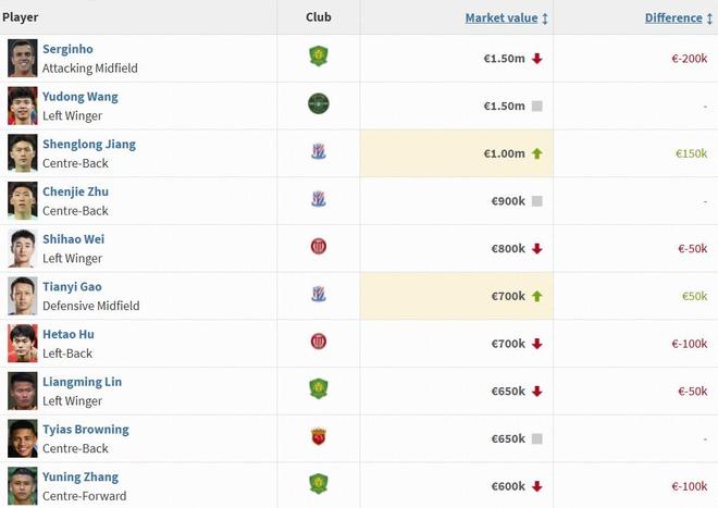 新一期中超国内球员身价榜前十(单位:欧元)1.塞尔吉尼奥 150万(下跌20万)1.王钰栋 150万(持平)3.蒋圣龙 100万(上升15万)4.朱辰杰 90万(持平)5.韦世豪 80万(下跌5万)6.高天意 70万(上升5万)6.胡荷韬 70万(下跌10万)8.林良铭 65万(下跌5万)8.蒋光太 65万(持平)10.张玉宁 60万(下跌10万)
