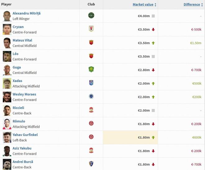 中超外援身价榜前十(单位:欧元)1.米特里策 浙江队 400万(持平)2.克雷桑 山东泰山 350万(下跌50万)2.维塔尔 上海海港 350万(上涨150万)2.莱昂纳多 上海海港 350万 (持平)5.古加 北京国安 280万(下跌70万)6.哈达斯 天津津门虎 200万(上涨50万)6.韦斯利 深圳新鹏城 200万(上涨20万)6.里切利 青岛西海岸 200万(持平)9.罗慕洛 成都蓉城 180万(下跌20万)9.古尔芬克尔 成都蓉城 180万(上涨60万)9.阿齐兹 青岛西海岸 180万(下跌20万)9.布尔克 云南玉昆 180万(下跌70万)