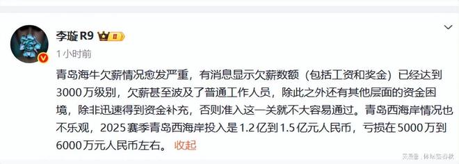 有人私下劝海牛老板乔伟光,既然这么难,不如趁机回到中甲,投入降下来,喘口气再说。可老乔在中国足球摸爬滚打了二十多年,那几年在低级别联赛的日子,他比谁都清楚,老乔不甘心青岛足球刚看到点高度就掉头向下。结果大家都看到了,空场情况下逼平北京国安,赢下天津津门虎,海牛硬是把命保了下来。问题在于,奇迹并不能年年复制。2025赛季开始前,期待中的股改和新资金始终没能落地,球队再次深陷保级泥潭。虽然还是留在了中超,但同时也留下了更沉重的账单。欠薪已经不是零星问题,据一位足球媒体人透露,海牛欠薪的数额已经达到了3000万,连工作人员都被波及,准入成了摆在眼前的一道坎。即便地方的扶持资金到账,但区级的配套资金却迟迟不见影子,时间一拖,压力越来越大。